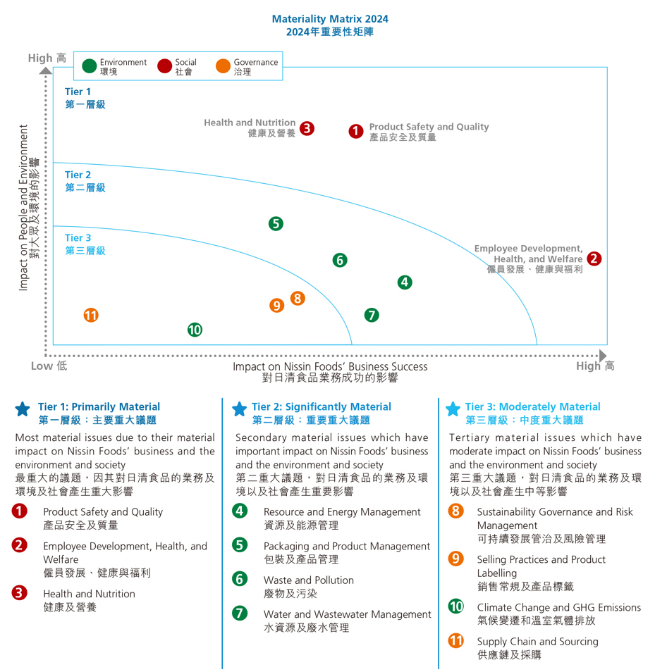 我们与公司领导层及负责管理风险的人员举行内部焦点小组会议,旨在评估及确认所强调议题的效果。透过该等面谈及焦点小组讨论,我们更深入了解该等议题对我们持份者(其重要性)及日清食品的财务表现(其财务重要性)的重要性。我们于感知模型中加入并考虑 是项全面识别、优先排序及核证过程的结果,以创建双重重要性矩阵。